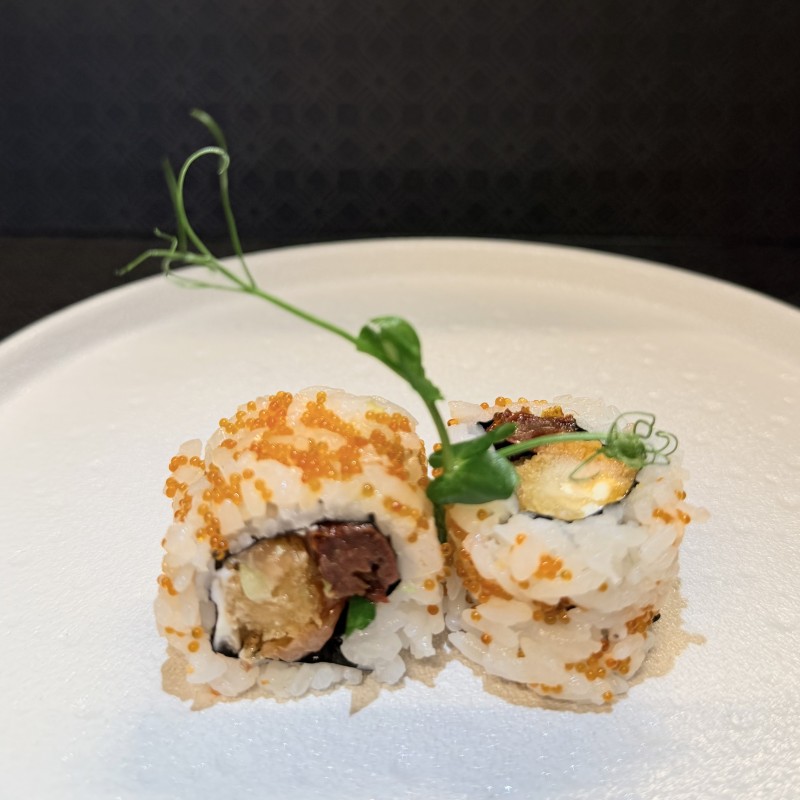 Tempura, tomate séchée , oignons, crème cheese, tobiko et mayo spicy